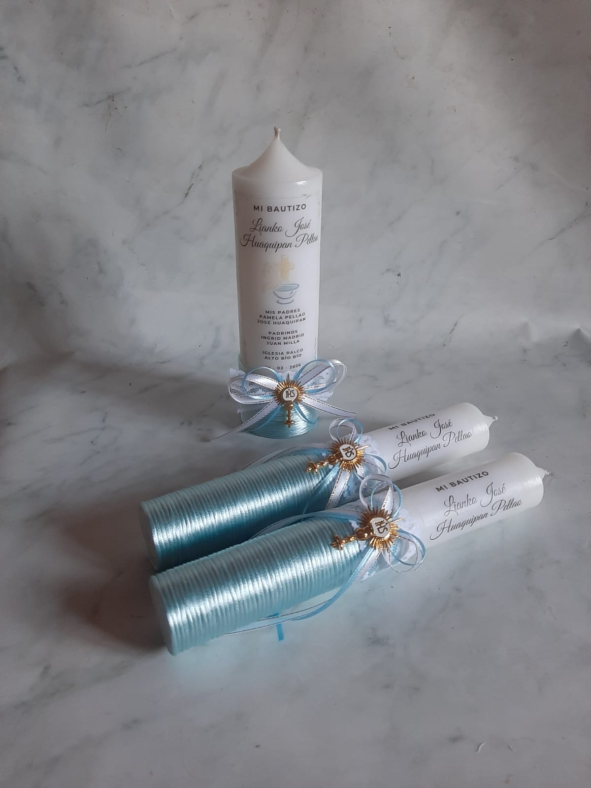 Cirio Bautismo & Dos Velas de Padrinos Azul